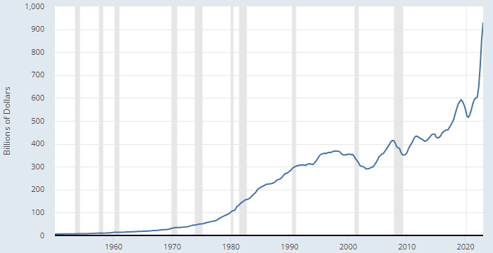 Значительную тревогу внушает и резкий рост процентных платежей по госдолгу США. По данным ФРБ Сент-Луиса, в I квартале 2023 календарного года данный показатель составил $928,93 млрд в годовом выражении. Через 12 месяцев благодаря эффекту более высоких процентных ставок процентные платежи по госдолгу США могут достичь $1,3 трлн в годовом выражении.