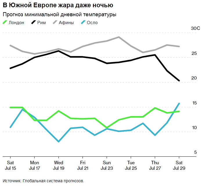 Жаркая погода также сохраняется на Пиренейском полуострове, поскольку Мадрид приближается к рекордной температуре 42,7°C, установленной в августе 2021 года. Согласно данным Global Forecast System, 18 июля в испанской столице ожидается температура 42,1°C. Между тем, по данным Bloomberg и Maxar Technologies Inc. , в субботу в Берлине ожидается температура выше 35 градусов по Цельсию, самая жаркая в этом году.