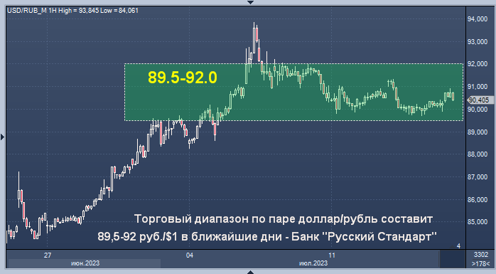 Торговый диапазон по паре доллар/рубль, скорее всего, составит в ближайшие дни 89,5-92 руб./$1, по паре евро/рубль - 100 - 102,5 руб./EUR1, считает представитель "Русского Стандарта" Максим Тимошенко.