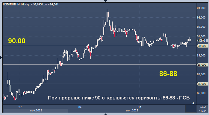 "Американская валюта начала торги понедельника на российском рынке с роста на фоне геополитической ситуации. Мы считаем, что в случае если доллар сможет развить снижение под отметку 90 руб./$1, то открывается горизонт выхода к нашим целевым значениям 86-88 руб./$1 в ходе ближайших торговых сессий.