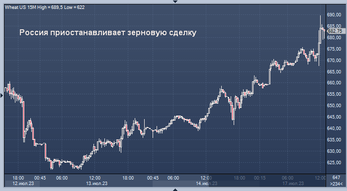 Самый активный контракт Чикагской торговой палаты на пшеницу Wv1 подорожал на 3,4% до 684 долларов за бушель в 09:10 по Гринвичу после более раннего роста более чем на 4%.