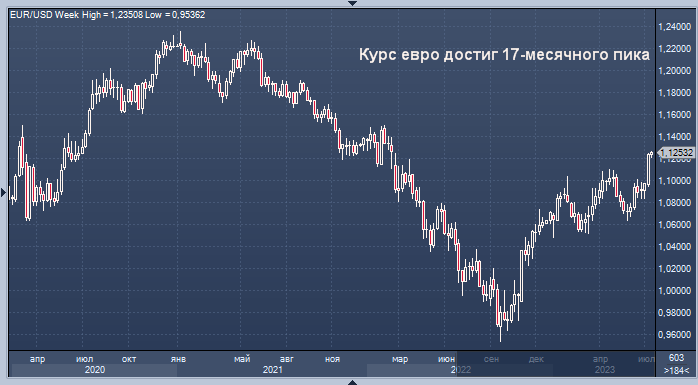 По отношению к доллару США евро достиг нового 17-месячного максимума в 1,1256 доллара, в то время как фунт стерлингов вырос на 0,16% до 1,30945 доллара, недалеко от максимума прошлой недели в 1,3144 доллара, также самого высокого уровня с апреля 2022 года.