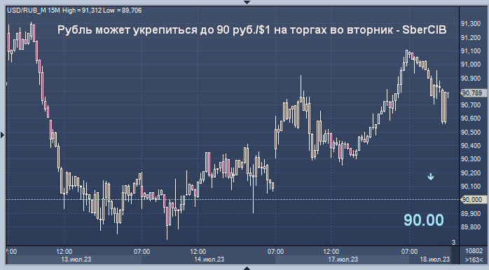 Курс рубля по отношению к доллару США может вернуться к уровню 90 руб./$1 на торгах во вторник, волатильность рубля низкая и ситуация на валютном рынке в целом спокойная, пишут эксперты SberCIB Investment Research.