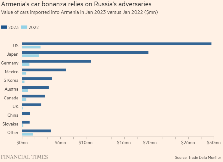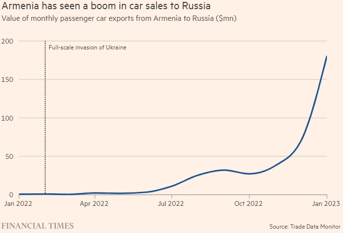 Армения не производит автомобили, но экспорт автомобилей из крошечной страны в Россию резко вырос после начала конфликта на Украину — с 800 000 долларов в январе 2022 года до чуть более 180 миллионов долларов в том же месяце этого года.