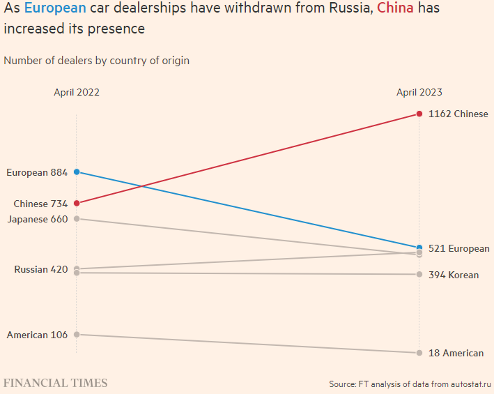 В настоящее время также продается больше новых китайских автомобилей, при этом рыночная доля государственного бренда Chery выросла на 165% в первом квартале этого года по сравнению с прошлым годом. Россия стала крупнейшим импортером китайских автомобилей.
