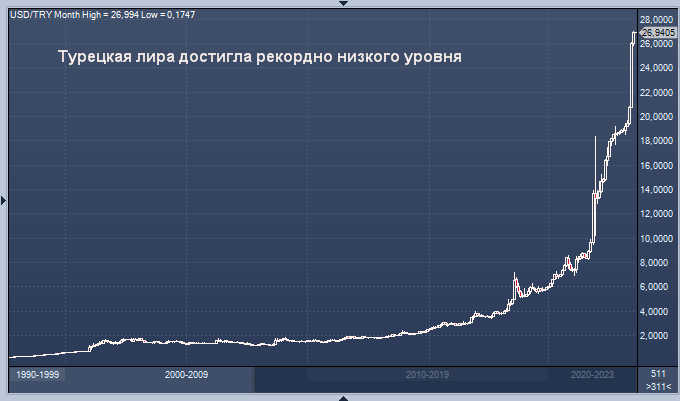 Лира достигла рекордно низкого уровня в 26,94 по отношению к американской валюте, опустившись с закрытия понедельника на отметке 26,3505. В этом году она ослабла на 30%.