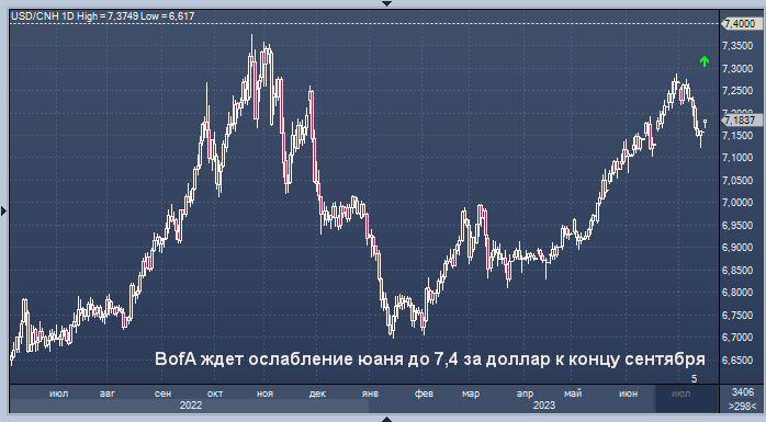 Прогноз Bank of America на конец квартала на уровне 7,40 является необычным. Оффшорный юань немного укрепится до 7,15 за доллар к концу сентября, согласно средней оценке аналитиков, составленной Bloomberg.