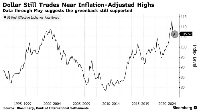 Между тем, согласно последним данным Банка международных расчетов, валюта США торгуется вблизи исторических максимумов с поправкой на инфляцию до конца мая. Примечательно, что данные не включают резкую распродажу доллара в июле, когда индикатор Bloomberg доллара упал почти на 2% на прошлой неделе до минимумов апреля 2022 года.