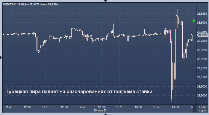 Лира очень ненадолго выросла, но потом сразу же обновила минимум после объявления решения ЦБ. Сейчас она снова пытается расти, но все равно торгуется с потерей 0,46% с начала дня по отношению к доллару.