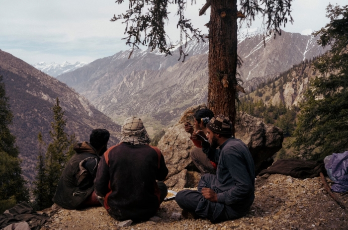 Рабочие во время обеденного перерыва возле шахты в долине Парун в провинции Нурестан.