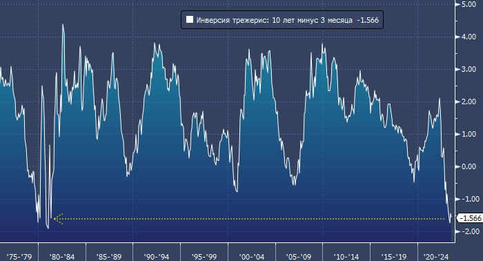 В последние 50 лет подобные инверсии кривой практически неизбежно предвещали рецессии в США. Причем, чем более масштабной была инверсия, тем более глубокой — рецессия.