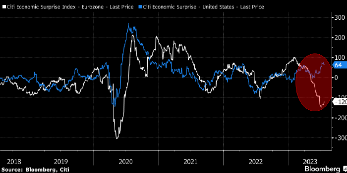 Индекс экономических сюрпризов Citi: белым — Еврозона, голубым — США. Источник: Bloomberg