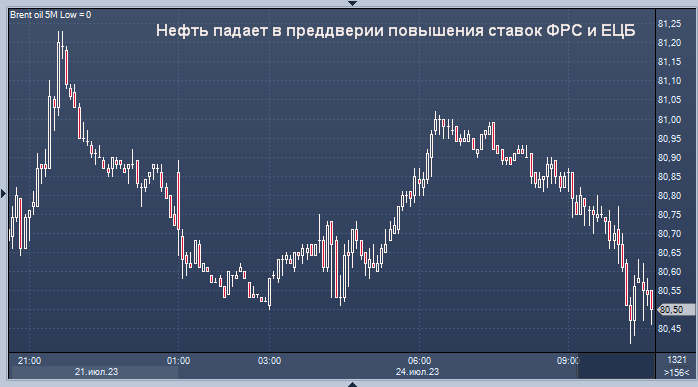 Цены на нефть снизились в понедельник, поскольку трейдеры ожидали новых сигналов о повышении ставок от центральных банков США и Европы, хотя сокращение предложения и надежды на стимулирование со стороны Китая поддерживают Brent на уровне 80 долларов за баррель.