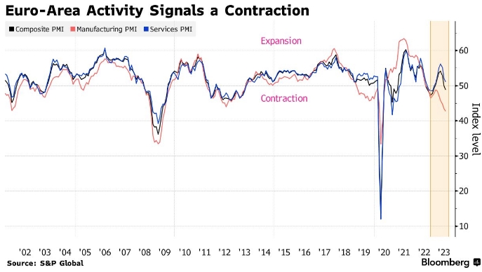 В зоне евро экономика частного сектора сократилась больше, чем ожидалось, в июле, что высветило затруднительное положение Европейского центрального банка, готовящегося повысить процентные ставки в конце этой недели.