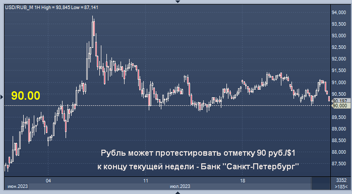 "Повышение ключевой ставки оказывает ограниченную поддержку рублю, но решение о начале продаж юаней со стороны ЦБ для зеркалирования инвестиций из ФНБ ограничивает риски ослабления рубля. В понедельник курс USD/RUB находится у 90,5 руб./$1. Другие валюты EM с утра преимущественно слабеют. Пик текущего налогового периода приходится на пятницу, и на фоне наращивания продаж валюты экспортерами курс USD/RUB может протестировать отметку в 90 руб./$1", - сообщили в банке "Санкт-Петербург".