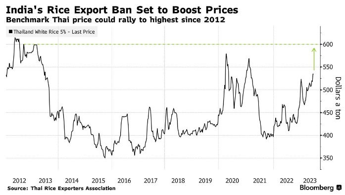 Чукиат сказал в интервью, что, поскольку Вьетнам, еще один крупный поставщик риса, уже предлагает поставки по цене 600 долларов за тонну для 5% белого риса, Таиланд может последовать этому примеру. Скачок до этого уровня подтолкнет цены в Таиланде к самому высокому уровню с 2012 года, и сравним с текущим уровнем в 534 доллара за тонну, что близко к двухлетнему максимуму.