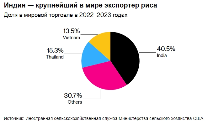Индия — крупнейший в мире экспортер риса. Доля в мировой торговле в 2022–2023 годах. Источник: Иностранная сельскохозяйственная служба Министерства сельского хозяйства США.