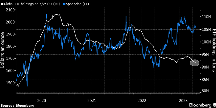 Запасы золота в мировых ETF (белым, в млн тонн, по состоянию на 24 июля, правая шкала) и цена золота в долларах за унцию (голубым, левая шкала). Источник: Bloomberg