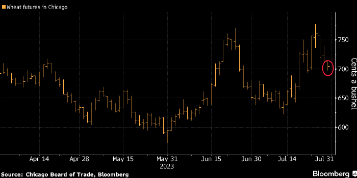 Пшеница на чикагской CBOT дешевеет третью сессию подряд, и к настоящему моменту цены отыграли почти весь рост понедельника-вторника, вернувшись в область закрытия прошлой недели. Напомним, что во вторник, 25 июля, наиболее ликвидный (сентябрьский) фьючерс на пшеницу на CBOT закрылся на самом высоком уровне с середины февраля на фоне прекращения черноморской зерновой сделки и последовавшего за этим разрушения инфраструктуры порта Одессы.