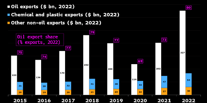 Экспорт из Саудовской Аравии (в млрд USD): нефть (белым), химическая продукция и пластик (голубым) и прочий экспорт (желтым). Источник: Bloomberg Intelligence