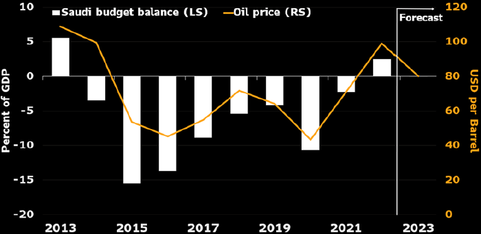 Тем не менее поддержка цен на нефть на высоком уровне за счет сокращения добычи выглядит несколько рискованной стратегией, учитывая риски глобальной рецессии. Однако эти риски могут оказаться, скорее, долгосрочными: по прогнозу Bloomberg, средняя цена нефти Brent составит по итогам текущего года примерно $80 за баррель, что позволит стране свести дефицит бюджета к $3,2 млрд (эквивалентно 0,3% от ВВП).