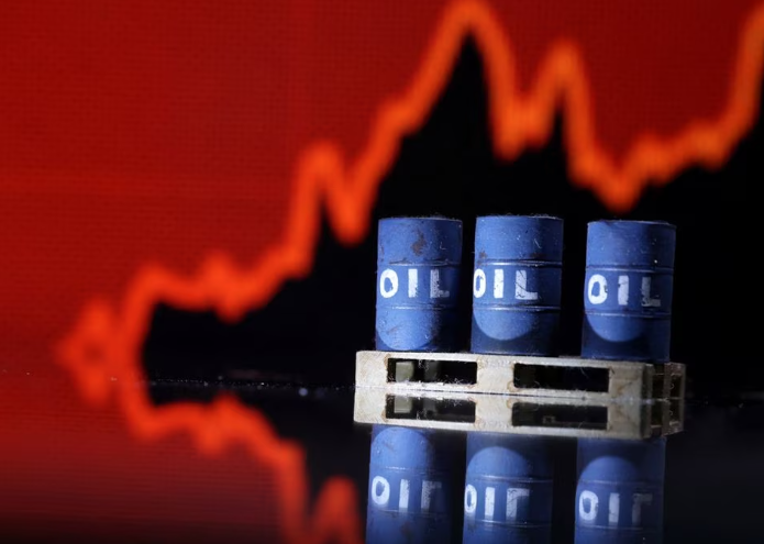Модель нефтяных бочек видна перед графиком роста запасов на этой иллюстрации, 24 июля 2022 года. REUTERS/Дадо Рувич