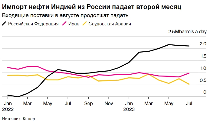 По словам Катона, в этом месяце импорт Индии из России может упасть до 1,6 млн баррелей в день. Это будет самый низкий показатель с января.
