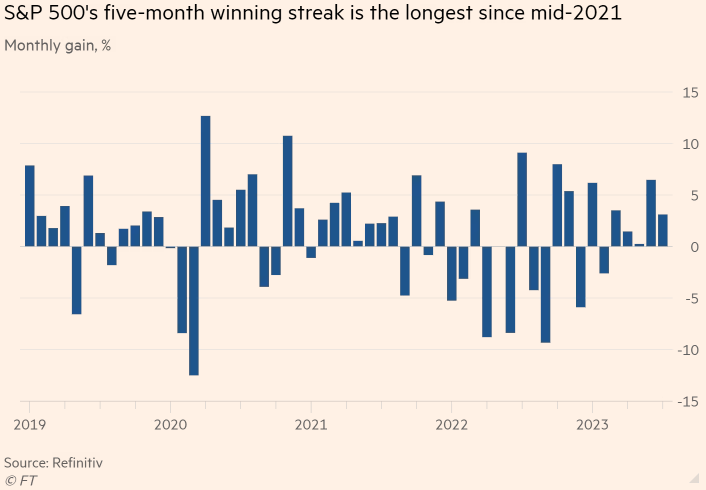 S&P 500 вырос на 3,1% в июле, в том числе на 0,2% во время последней сессии месяца в понедельник. Этот подъем ознаменовал рост индекса голубых фишек пятый месяц подряд и самый продолжительный такой рост с лета 2021 года.