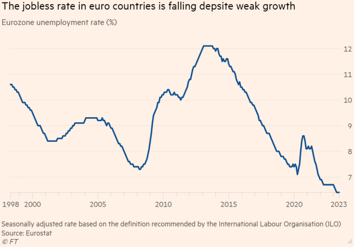 Евростат, статистическое агентство ЕС, сообщило во вторник, что уровень безработицы в июне составил 6,4% — рекордно низкий уровень в еврозоне — поскольку он также пересмотрел вниз этот показатель за предыдущие два месяца с 6,5% до 6,4%.
