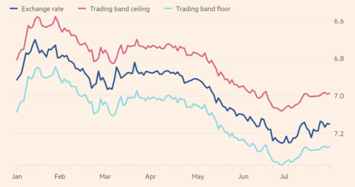 Трейдеры заявили, что официальные ограничения на изменение валютного курса, а также косвенное вмешательство государственных банков, скупающих валюту, помогли прервать затянувшееся падение юаня после того, как 24 июля Политбюро Коммунистической партии заявило о поддержке «в целом стабильного» курса на «соответствующем равновесном уровне».