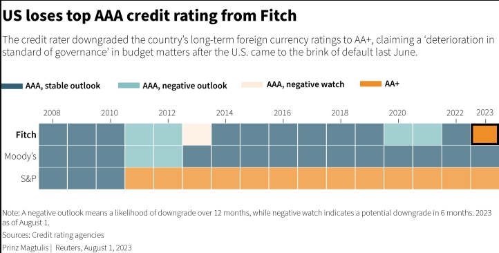 Fitch Ratings понизило долговой рейтинг США с тройной А до двойной А плюс, сославшись на ухудшение фискальных условий и управления, через два месяца после того, как политическое балансирование на грани войны поставило крупнейшую экономику мира на грань суверенного дефолта.