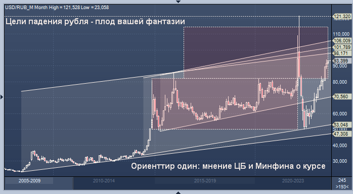Но я не сторонник чисто бухгалтерской точки зрения на рубль. Я сторонник, того, что правительству нужно усредниться после убытков, понесенных при рубле по курсу 50-70. Что является лакмусовой бумажкой для рублевого тренда? Именно официальное мнение, мнение ЦБ и правительства. Какое оно сейчас? Пусть рубль падает. Как это преподносится? У нас свободный рынок, управляемый флоатинг, мы уже наступали на грабли управления курсом, прожигали резервы, а курс должен быть это демпфером для всех экономических шоков. Он должен их смягчать.