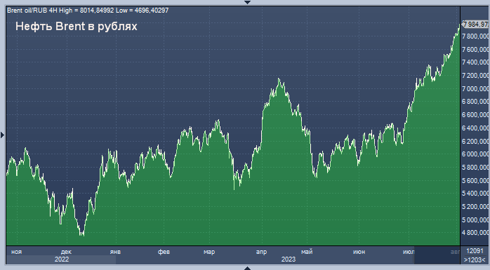 График бочки нефти в рублях как примерный показатель роста рублевых доходов российских нефтяных экспортеров