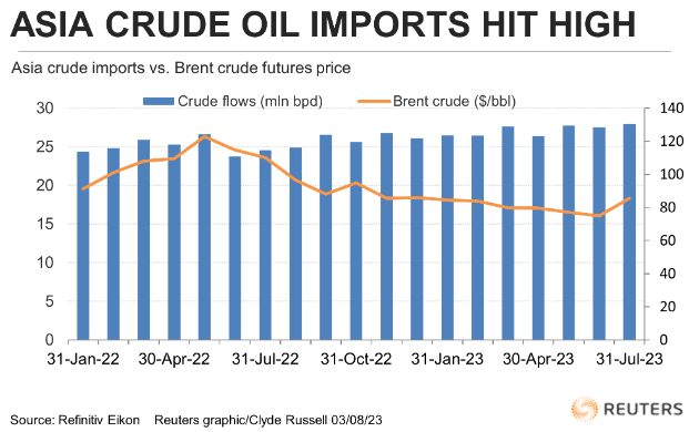 По данным Refinitiv, за пределами Китая другие крупные покупатели в Азии также увеличили закупки нефти в июле, при этом импорт в Индию, по оценкам, достиг пятимесячного максимума в 4,94 млн баррелей в сутки.