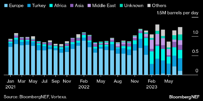 Экспорт дизеля из РФ в регионы мира (слева направо, в млн б/д): Европа, Турция, Африка, Азия, Ближний Восток, неизвестно, другие регионы. Данные: BloombergNEF, Vortexa, источник: Bloomberg