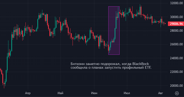 Биткоин заметно подорожал во второй половине июня, когда крупнейшая мировая управляющая компания BlackRock сообщила о планах запустить профильный ETF. Но в последние недели биткоин показывал невнятную динамику.