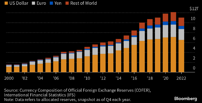 Объем различных валют в мировых резервах (данные на конец 2022 г.). Источник: Bloomberg
