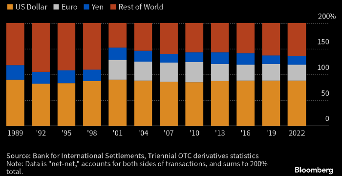 Доля различных валют в мировых транзакциях в 2022 г. (данные рассчитываются за каждую сторону транзакции, поэтому их общий объем составляет 200%, а не 100%). Источник: Bloomberg