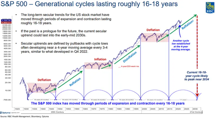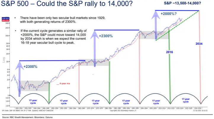 В этом году фондовый рынок вырос почти на 20%, но это ралли может быть частью более крупного цикла бычьего рынка, который к 2034 году поднимет S&P 500 до 14 000.