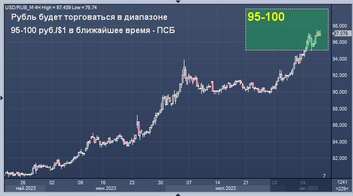 Мы не исключаем, что доллар инерционно попытается пойти выше, в то же время отмечаем заметную техническую перегретость американской валюты, поэтому потенциал ее роста считаем по-прежнему ограниченным. Целевым диапазон колебания для доллара на ближайшую перспективу видим в 95-100 руб./$1", - пишет главный аналитик Промсвязьбанка (ПСБ) Егор Жильников.