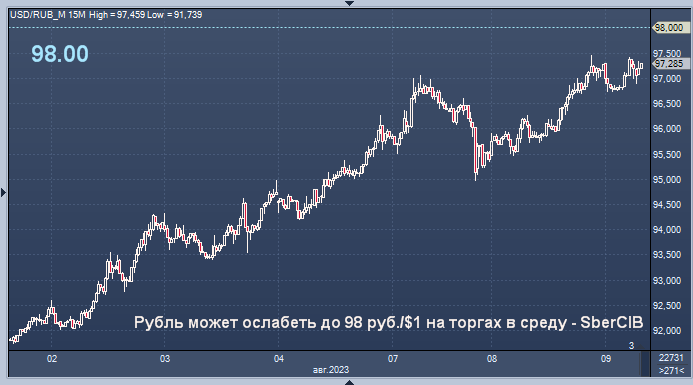 Рубль может ослабеть по отношению к доллару США до уровня 98 руб./$1 на торгах в среду, обороты по паре доллар/юань снизились (активные продажи юаней экспортерами пока неустойчивы), пишут эксперты SberCIB Investment Research.