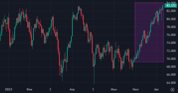 С начала июля котировки нефти WTI прибавили около $15 за баррель, и если эта ситуация сохранится до конца августа, то данный фактор может повысить значение широкого индекса потребительской инфляции за текущий месяц на 0,3%. Если же в дальнейшем цены на нефть вырастут до $100 за баррель, то, по нашим подсчетам, широкий индекс расходов на личное потребление (PCE) в США дополнительно прибавит 0,7% в III кв. 2023 года и еще 0,1% в I кв. 2024 года.