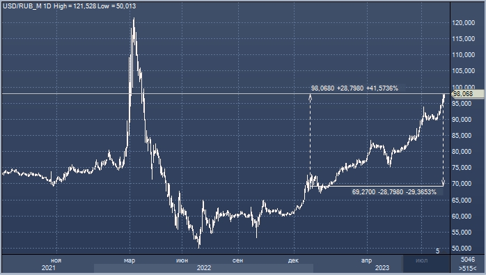 В этом году доллар укрепился к рублю примерно на 40%, что ставит рубль в тройку худших валют развивающихся рынков наряду с турецкой лирой и аргентинским песо. Валюта ослабла выше 98 за доллар во время торгов в среду и приближается к 100 по отношению к доллару США, уровню, который в последний раз также наблюдался в марте 2022 г., через месяц после начала специальной военной операции на территории Украины.
