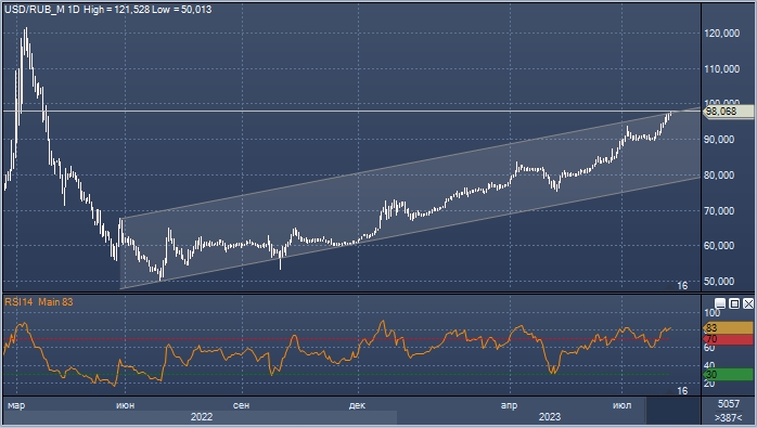 8 августа Банк России в опубликованном «Обзоре рисков финансовых рынков» подтвердил желание сальдировать продажи и покупки по бюджетному правилу. Курс USDRUB уже был около 97,00.