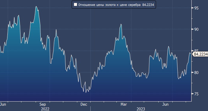 С начала года долларовая цена золота выросла почти на 5,5%, а долларовая цена серебра снизилась почти на 5%. На этом фоне отношение цены золота к цене серебра выросло с начала года с 76х до 84х, тогда как среднее значение данного показателя за последние 10 лет составляет 77х, за последние 20 лет — 67х, за последние 50 лет — 61х.