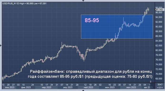 Отклонения от этого диапазона, по мнению экспертов банка, вполне возможны, в особенности на фоне низкой ликвидности валютного рынка (в том числе, стратеги не исключают возможного точечного ослабления курса рубля выше 100 руб./$1 в течение августа).