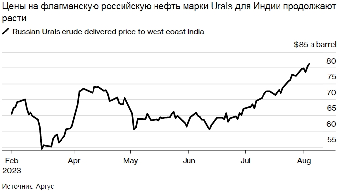 Данные о ценах от Argus Media Ltd. показывают, что 4 августа нефть марки Urals, поставляемая на западное побережье Индии, стоила выше 81 доллара за баррель по сравнению с примерно 68 долларами месяцем ранее.
