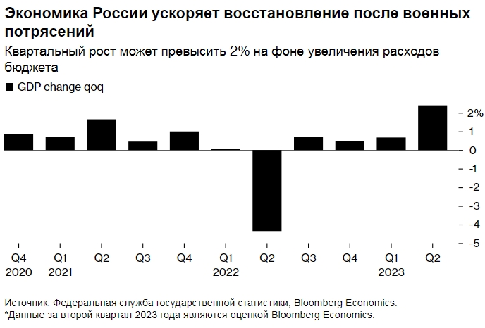 Экономика России ускоряет восстановление после потрясений, вызванных шквалом западных санкций. Квартальный рост может превысить 2% на фоне увеличения расходов бюджета. Источник: Федеральная служба государственной статистики, Bloomberg Economics. *Данные за второй квартал 2023 года являются оценкой Bloomberg Economics.