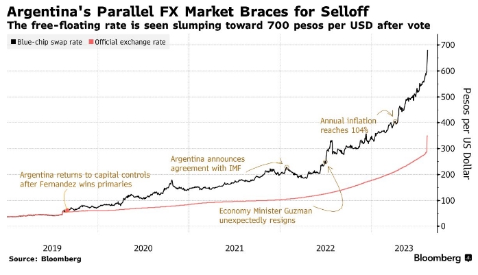 Нынешнее правительство на этой неделе девальвировало валюту на 18% до 350 после поражения на решающих первичных выборах в воскресенье. Аргентинские активы резко упали после более сильного, чем ожидалось, выступления на выборах кандидата от либертарианцев Хавьера Милеи, который хочет долларизировать экономику и упразднить центральный банк.