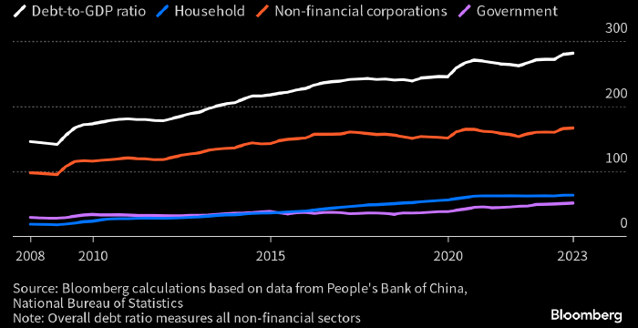 Отношение совокупного долга Китая к ВВП (белым), задолженности домохозяйств к ВВП (голубым), задолженности нефинансовых компаний к ВВП (оранжевым) и госдолга к ВВП (фиолетовым). Источник: Bloomberg